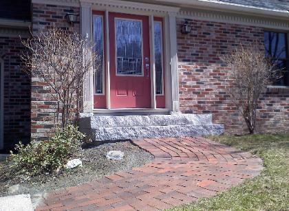 The granite steps and brick walkway(left), installed by RL Sanborn masonry, compliment this brick home beautifully. The solid granite steps are set on a poured concrete, steel reinforced footing. They are here to stay! |